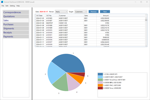 General Dashboard Digital dashboard (數位儀表板) 將資料彙集並處理成作業的、分析的或策略的報表及視覺圖案。出口貿易没有那麼即時,不像捷運或電力輸配那樣需要作業型的儀表板。策略型的需求暫時不提,分析型的儀表板或是很好的考量對象。 我們把整個 ET7.0 的資料都包含起來,分別就每一部份的內容做分析,並把最好的六個對像加總,製做成圖。比如銷售,我們做金額的客戶及業務每日、每周、每月或每年的分析。對於報價,我們則做報價項目數量的分析。整體情況如下: