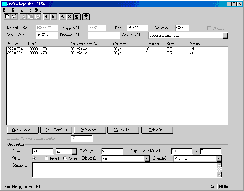 | 2009-2-18 | SP3 Secured | gl54czp.exe. 非繁體中文視窗使用者改下載 gl54zip.exe. | Item details 增加 item bar code, P/O remarks 及 product note. Inspection 及 product note 可用系統編碼第 6 字設定使用 part 或 item 之資料. |