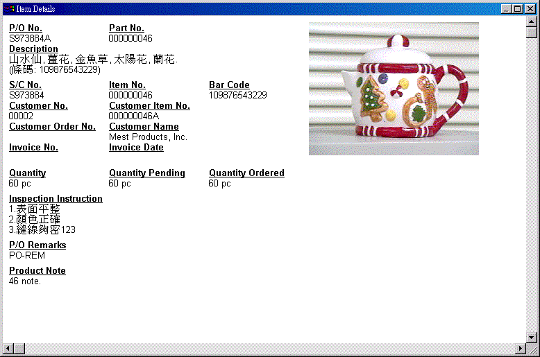| Item Details 按鈕 | ![]() 關於 inspection instructions, P/O remarks 和 product note, 參考底下系統編碼 INSPECTION-GENRE 第 4 到 6 字的設定. |