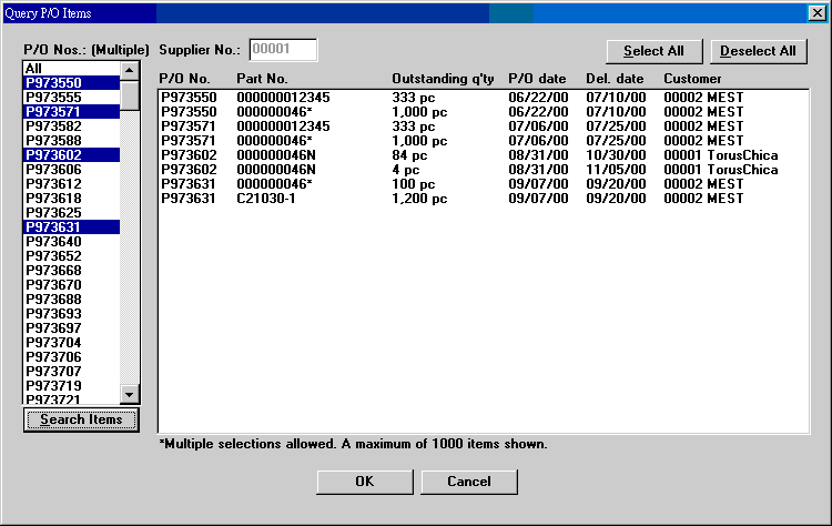 | Query Items | ![]() 左欄為廠商有效訂貨單. 選好訂貨單號碼後 (可複選), 按 Search Items 擷取所有貨號, 顯示於右欄. 於右欄選擇要驗項目後, 按 OK 將貨品轉入第一畫面之貨品明細. |