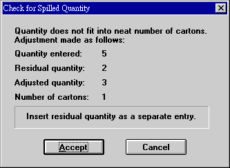 按 Accept, 數量先換成 adjusted quantity, 箱數為 number of cartons. 按 Insert 存檔後, 緊接著數量會換成 Residual quantity, Outer 亦改為 Residual quantity, 箱數變為 1. 這個表示尾箱, 所以你可視需要調整材數和重量. 若按 Cancel, 你應自行修改數量或 Outer, 讓數量能成為整箱. 再按 Insert 存檔. |