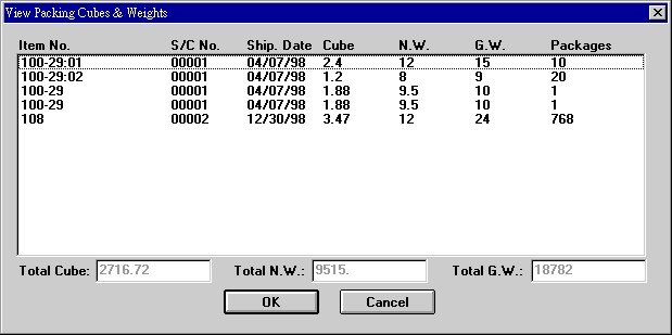 | Packages | 箱數. 系統會根據出貨數量 (Quantity) 與外箱數量 (Outer) 自動算出箱數. 多個尾箱要併箱時, 選擇一個代表 Item, 在 Packages 處填 1, 並輸入此併箱之材數及重量等資料, 其餘 Items 之 Packages 均應填入 0, 包裝資料可以不填, 但數量要填. 列印裝箱單時, 要選擇依箱號排列. |