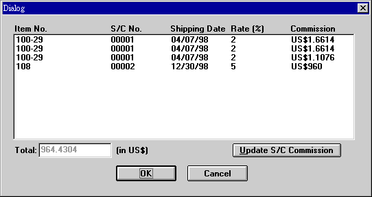 | 查詢 S/C 中的 shipping schedule. 此對話盒可保留在螢幕上; 亦即你可以一面查詢一面輸入主檔. |