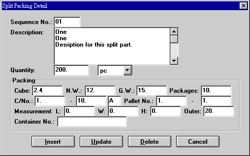 當你按 Insert 存好一筆資料或用 Search 找到一筆資料後, 可以按 Packing 框右下方的 Split... 鍵, 進入 Split Packing 對話方塊.