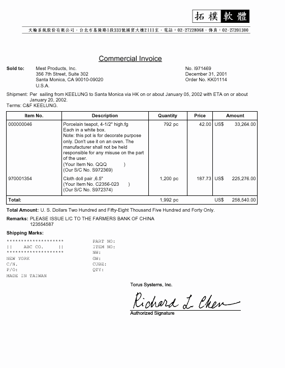 | L/C No. | 信用狀號碼. 若有數張信用狀, 擇一填入, 不過事後要修改 Payment 中文字. 若不用信用狀付款, 空白即可. |
