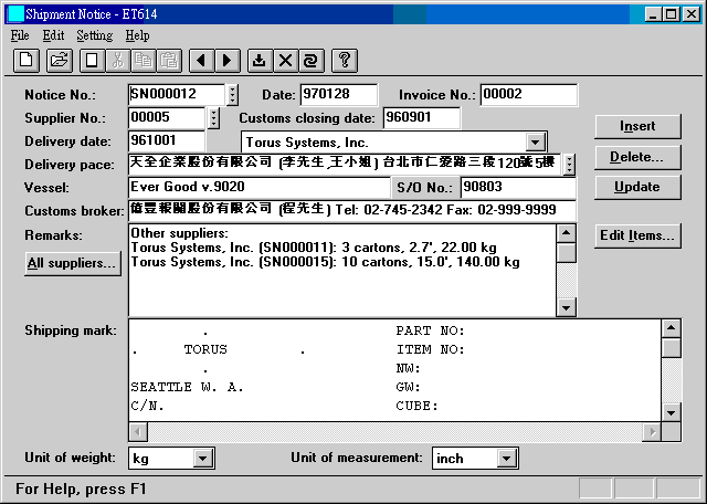 | Unit of weight | 重量單位. 應該和 invoice 的重量單位相同. 由系統編碼 UNIT-WT 設定. |