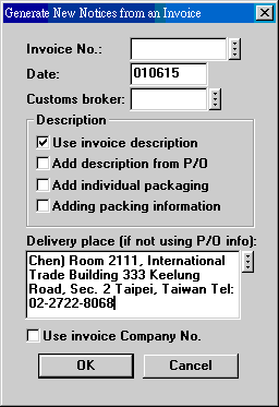 Date 為製單日期, 亦為出貨單文件日期. Customs broker 處輸入報關行編號 (為供應廠商編號). 若用 Invoice No. 右側小按鈕查詢, 系統會自動抓出製作 Invoice 時所填之報關行資料.