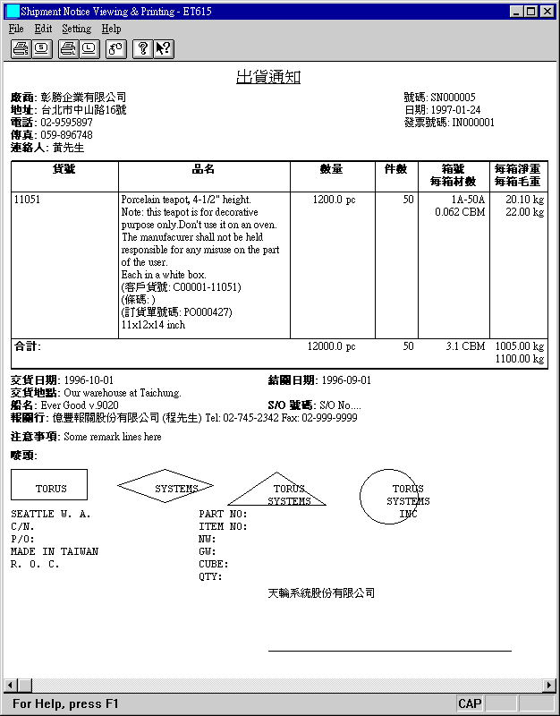 按 OK 電腦即依系統編碼 SHIP-NO 之序號產生本發票所有項目之出貨通知. 出貨廠商相同之貨號會匯合成一份出貨單. 要查詢一次產生之出貨單資料, 可用 Invoice No. (見下節.)